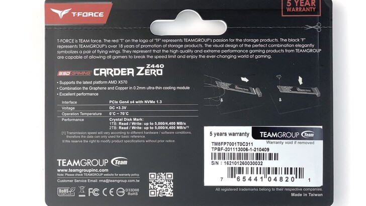 SSD 背後有一張產品貼紙,可以看到 SKU 是 TM8FP7001T0C311。並且有原廠五年保固。