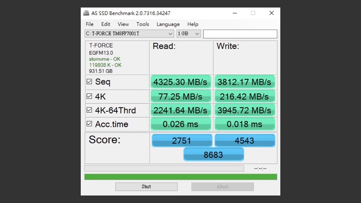 在 AS SSD 中,循序讀取速度 4325.30MB/s,循序寫入速度 3812.17MB/s,Access time 讀取為 0.026ms,寫入為 0.018ms。讀取分數 2751,寫入分數 4543,綜合分數 8683。