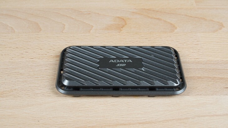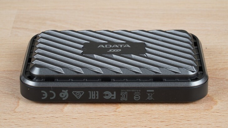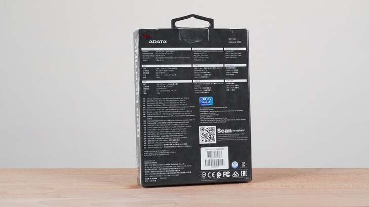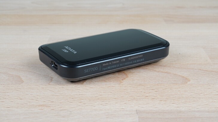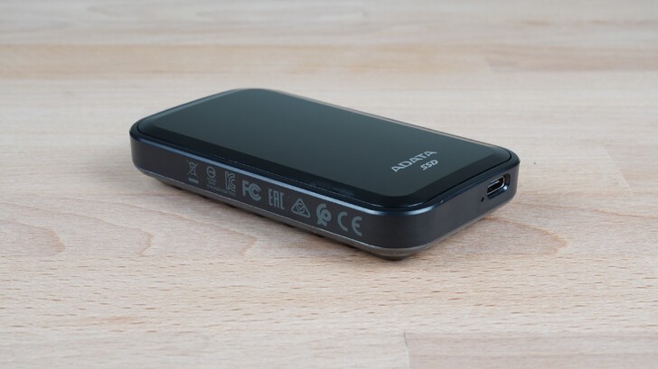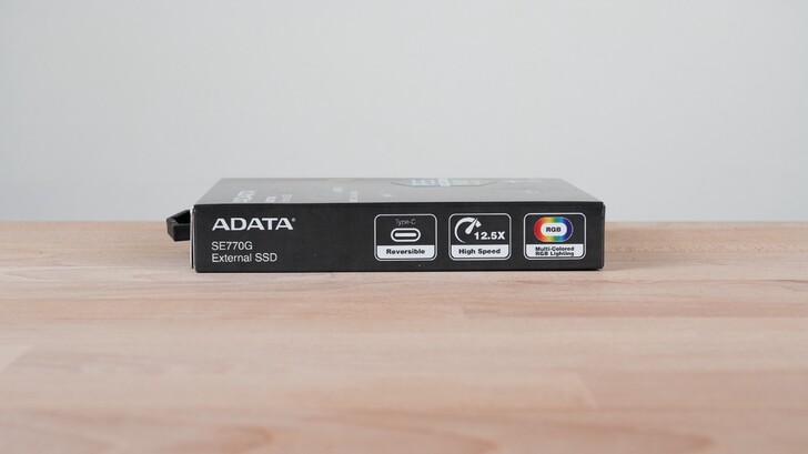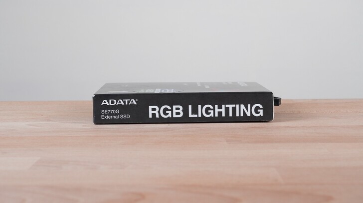 ADATA SE770G 的本體在未亮燈的情況下,上蓋主視覺是黑色亮面。側邊則有各種電子產品的認證標章。