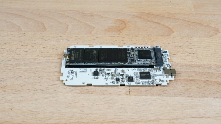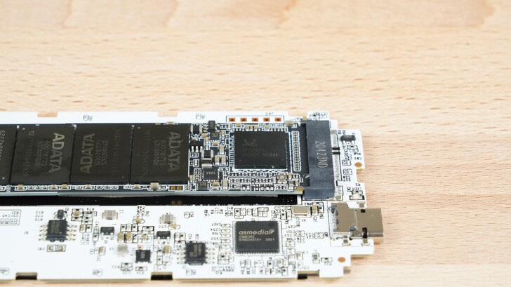 SSD 的儲存顆粒上印有 ADATA 的字樣,主控晶片是 Realtek RTS5763DL 主控。轉接晶片是 ASMedia 的 ASM2362,這顆晶片的作用就是將 USB3.2 Gen2 10Gbps 轉接成 PCIe Gen3 x2。
