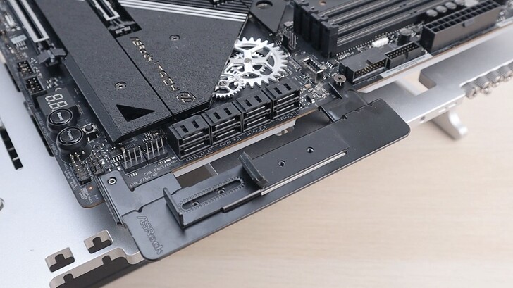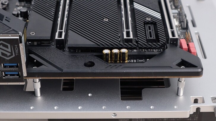支架上有個小鎖片,讓使用者微調固定的位置,藉以用小鎖片分擔較長顯卡的重量。ASRock 顯示這個功能正在申請專利中,是這次太極主機板的特色之一,不知道之後會不會變成太極系列的標誌之一。