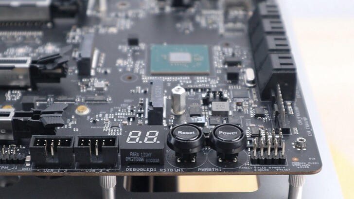主機板右下角有獨立的 Dr.debug 燈、Reset、Power、Clear CMOS 按鈕,都是高階主機板才有的規格。