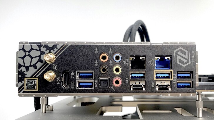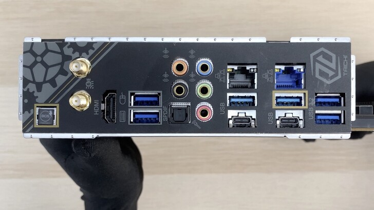 後 I/O 有一體式的擋版,規格包括 BIOS 按鈕一組、Wi-Fi 6 天線一個、HDMI 一個、USB3.2 Gen1 5Gbps(USB-A,具備 Lightning Gaming Ports)、Thunderbolt 4 兩個、2.5GbE 網路一個、GbE 網路一個、USB3.2 Gen2 10Gbps(USB-A)兩個、USB3.2 Gen1 5Gbps 兩個。