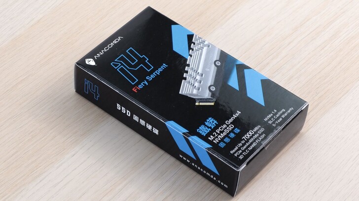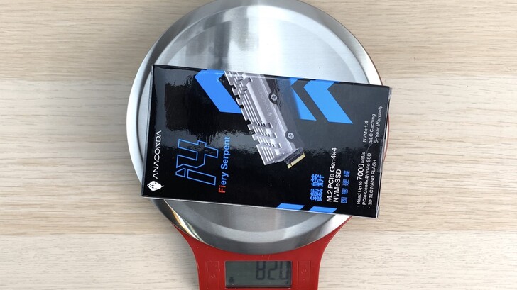 ANACOMDA i4 1TB M.2 PCIe Gen4 x4 SSD 整個包裝的重量達到 82g。整個包裝相較最近開箱過的 M.2 SSD,的確是重了不少,看來這個金屬散熱片應該不小哦。