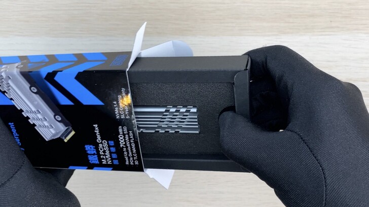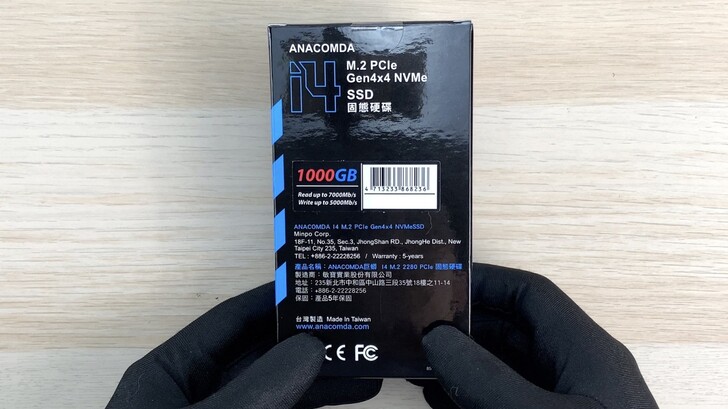 包裝盒外觀上印著讀取速度可以達到 7,000MB/s,支援 PCIe Gen4 x4 NVMe,並且採用 TLC 的 NAND Flash,還有原廠五年保固。