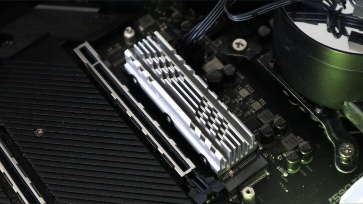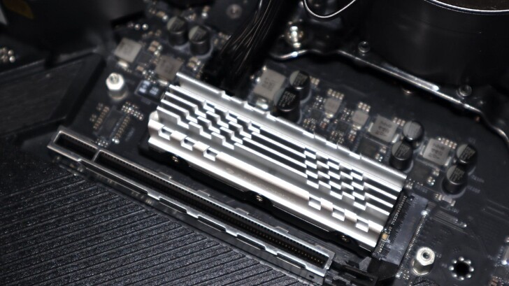 i4 安裝在主機板上也是滿好看的。相較不帶散熱片的 SSD,i4 這樣突出的設計,SSD 廠商的標誌和精心設計的散熱片造型就不會被主機板廠商的散熱片遮住。不過對於追求主機板外觀的使用者來說,無疑更希望採用主機板的散熱片。