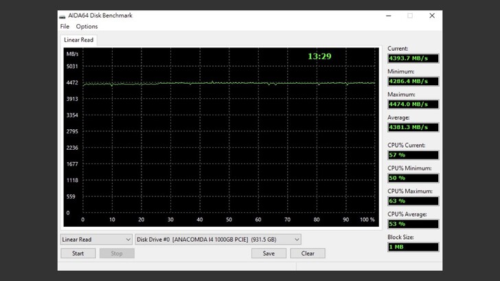 在 AIDA64 Disk Benchmark 的 Linear Read 中,不管是即時、最小值、最大值、平均值都有在 4,200MB/s~4,500MB/s 之間。