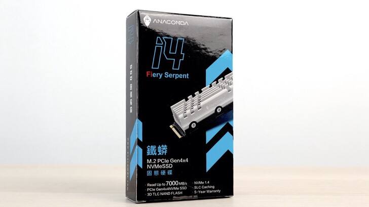包裝正面主要是黑色為底,中間有產品名稱 i4,不知道的人恐怕還以為是 Intel CPU 介於 i3 和 i5 之間。還有寫上 Fiery Serpent,特別把 Fi 變為紅色,凸顯鐵蟒的鐵的化學元素名稱。那這個 SSD 到底要叫 i4,還是鐵蟒呢?