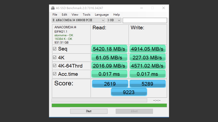 在 AS SSD 中,循序讀取速度約 5,500MB/s,循序寫入速度約 5,000MB/s,Access time 讀取為 0.017ms、寫入為 0.017ms。讀取分數 2619,寫入分數 5289,綜合分數 9223。