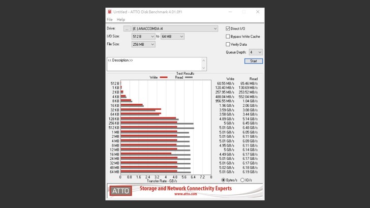 在 ATTO Disk Benchmark 中,可以看到寫入速度大約在 5,000MB/s 左右。讀取速度普遍也能有 6,000~6,500MB/s 的表現。