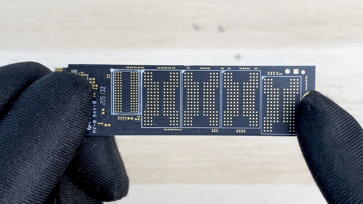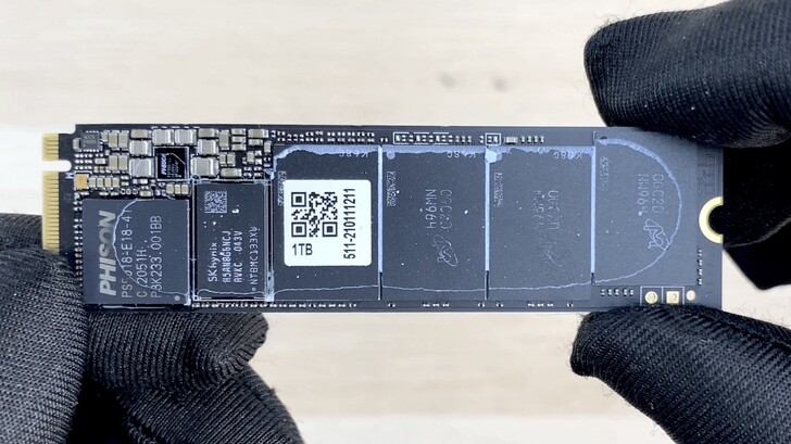 倒熱貼片是長條型的,頭尾還有圓弧角。可以看到主控晶片沒有完全覆蓋。採用 PHISON PS5018-E18–41 的方案,並具備一顆 SK Hynix H5AN8G6NCJ RVKC 的 RAM,以及四顆 Micron NW964 3D TLC NAND。