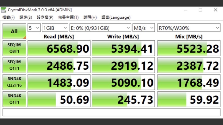 在 CrystalDiskMark 中,循序寫入速度 6,500~7,000MB/s 之間,循序寫入速度則在 5,000MB/s~5,500MB/s 左右。