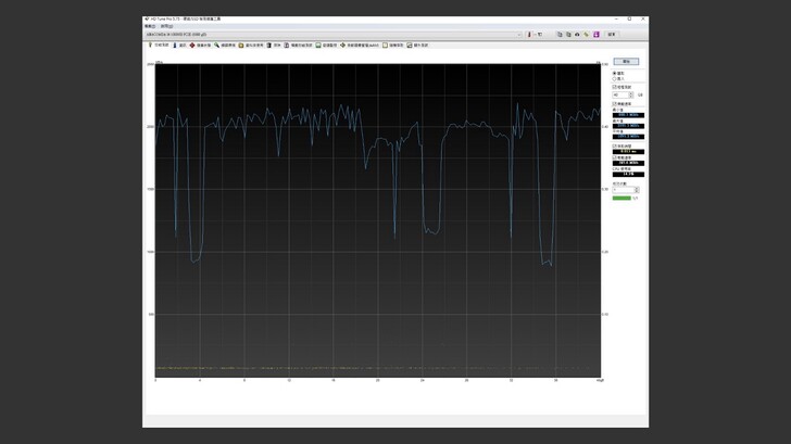 在 HD Tune Pro 的效能測試中,讀取模式下,可以看到線條波動有點大。最小值 888.5MB/s,最大值 2,191.5MB/s,平均值 1,895.2MB/s,Access time 0.015ms。