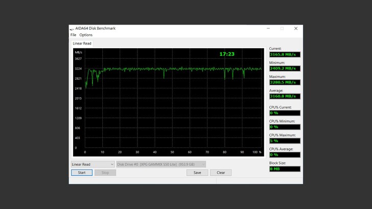在 AIDA64 Disk Benchmark 的 Linear Read 中,雖然剛開始有比較大的波動,但後面整體來說還算平穩。最小值 2,409.2MB/s 發生在剛開始的地方,後面就幾乎都是穩定在 3,220MB/s 那條線附近了。