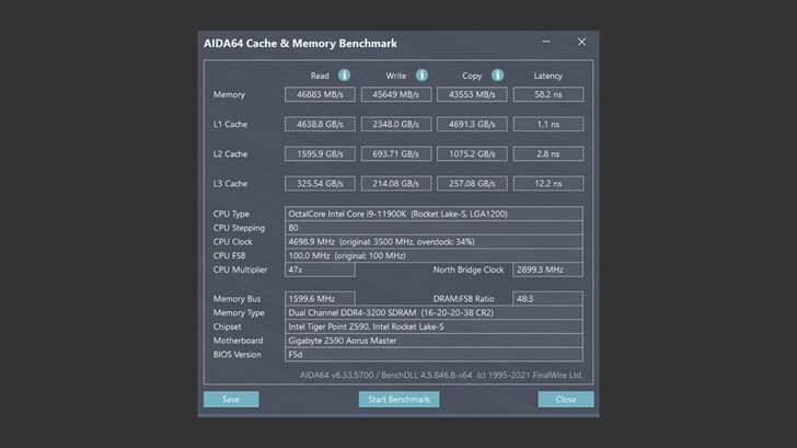 預設的 XMP 設置超頻至 DDR4-3200 之後,讀取速度為 46883MB/s,寫入為 45649MB/s,延遲是 58.2ns,表現算是非常好。