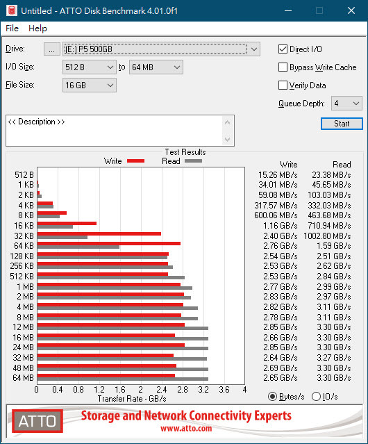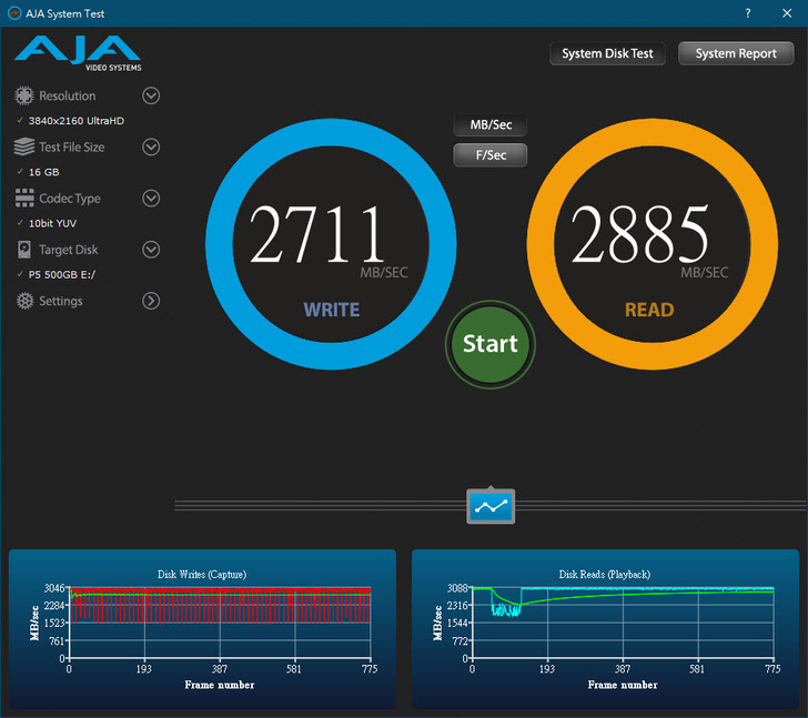解析度4K 檔案大小改為16GBytes 讀取2885MB/Sec 寫入2711MB/Sec