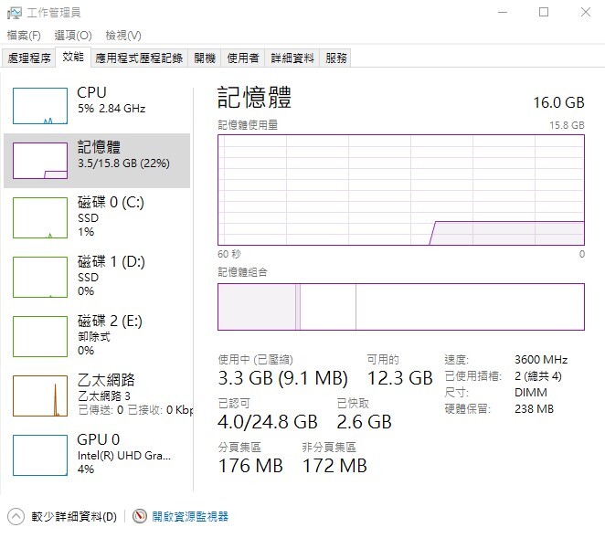 ▼回到系統後。使用工作管理員,可以看到速度的確升頻到3600 MHz