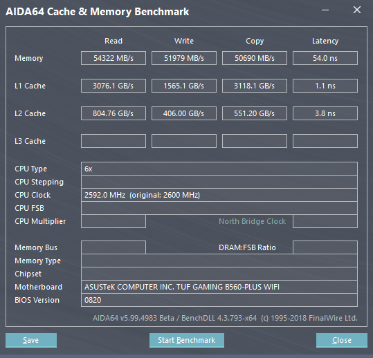 ▼使用AIDA64,原始狀態,記憶體在主機板上限的2666 MHz之下的測試數據