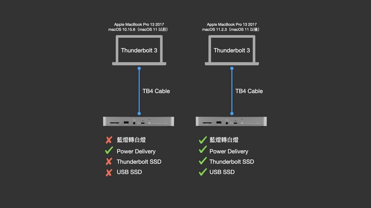 當時手上沒有 M1 MacBook Air 或 M1 MacBook Pro,先用手上 Thunderbolt 3 的 Intel MacBook Pro 測試。發現在 macOS 10.15 Catalina 的版本,是無法正常運作,只有充電的功能。將筆電升級系統到 macOS 11 Big Sur 就可以使用了,這點是使用 Intel CPU 的 Mac 使用者需要留意的部分。而 Apple M1 的電腦則是都可以直接使用,雖然我沒有實測過,不過 OWC 官方已經確認沒問題。