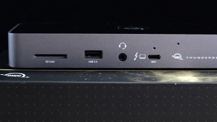 OWC TB4 Dock 前置有一個 SD Slot,支援 UHS-II 的速度。一個 USB2.0。一個 3.5mm 耳機接孔。一個 TB4 upstream 連接電腦,並提供 90W 的充電,也支援連接 USB4 的電腦。