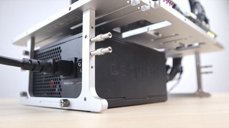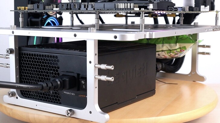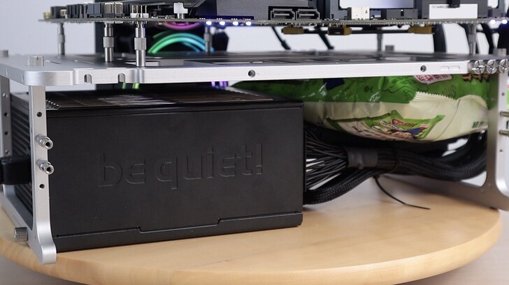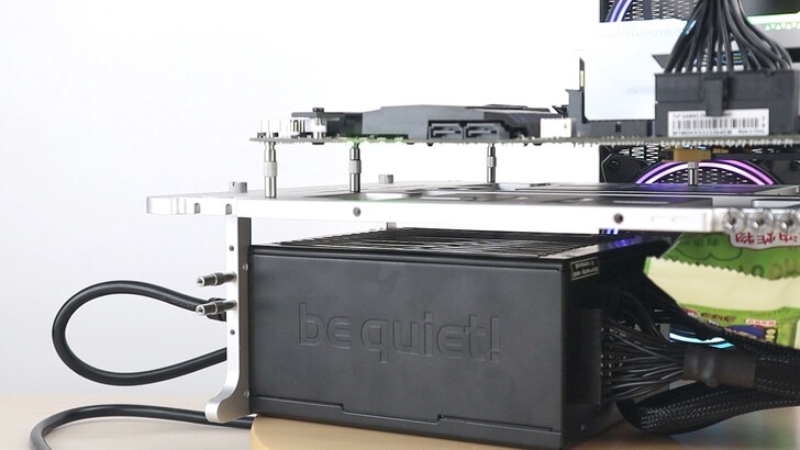 實際將電源安裝上裸測架,因為散熱需求,將 SP11 1000W 的風扇朝上安裝。整體裝機的效果相當不錯,側邊的 be quite! 也相當低調,想想這一顆可是滿載起來比家裡的微波爐還耗電呢 XD