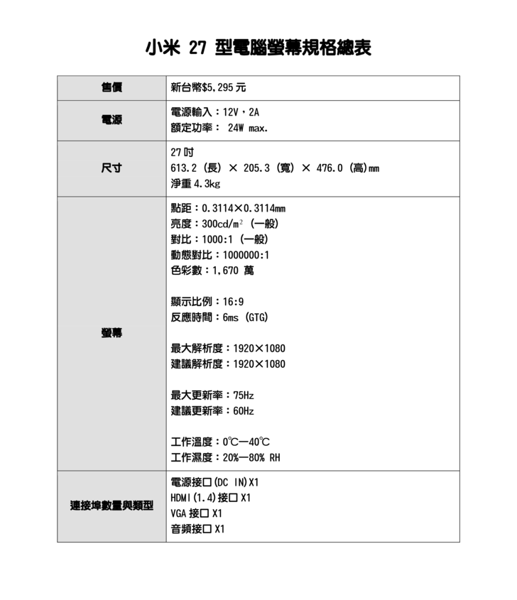 電腦週邊商品的需求,小米台灣推出「小米 27 型電腦螢幕」,採用IPS 螢幕,配備1920×1080 FHD 高解析度、支援 100% sRGB 寬廣色域,以零死角的出色畫質呈現專業影像品質,更以超窄邊框及最纖薄處僅7.5mm的機身,讓辦公空間不擁擠,全力應援用戶的高效工作。「小米 27 型電腦螢幕」售價為新台幣$5,295元,將於6月18日於小米商城mi.com、小米實體門市、PChome24h 購物小米旗艦館、法雅客網路商店與friDay購物陸續開賣。
