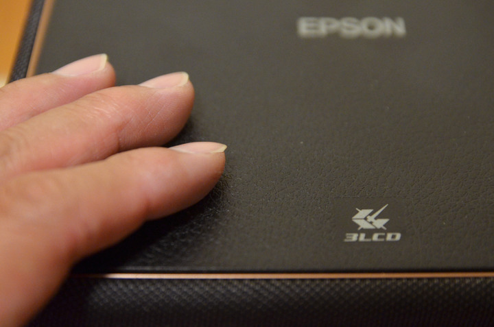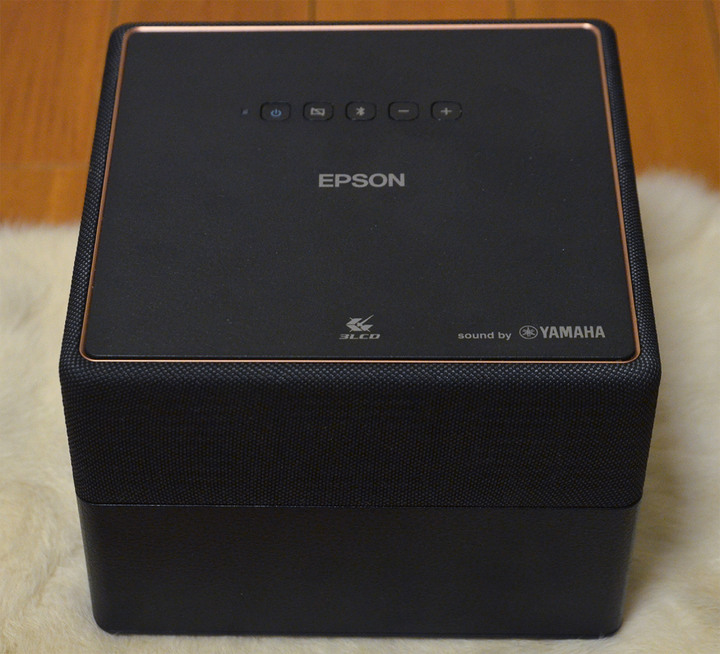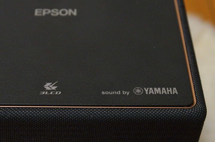 ▲ EF-12外觀設計跳脫一般投影機設計概念,採類似高級音箱的精緻典雅配色與造型,頂部中間 EPSON LOGO處有快捷控制按鍵,下方則標示 3LCD 與 YAMAHA 調校字樣。