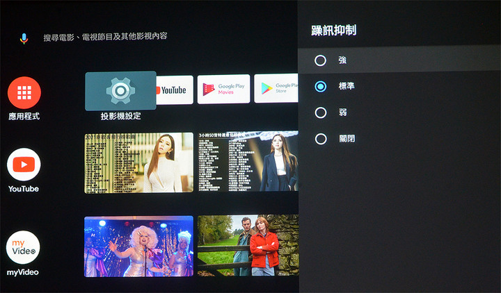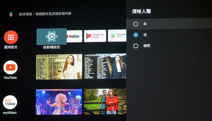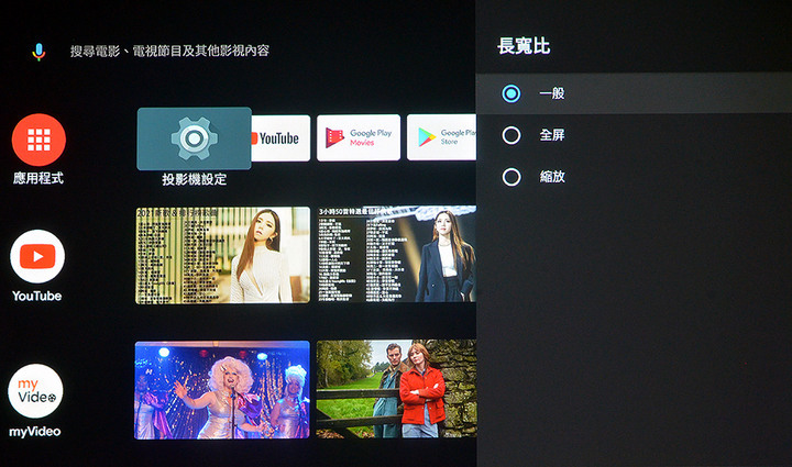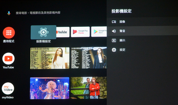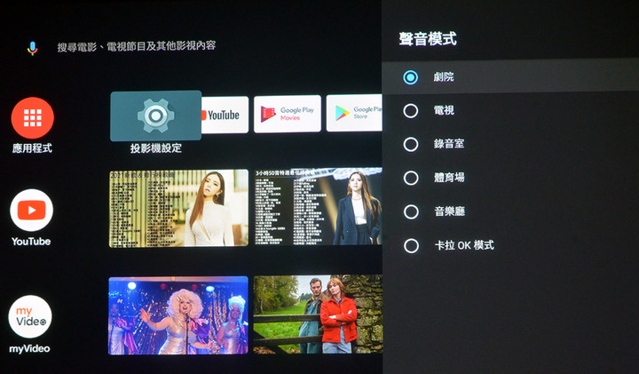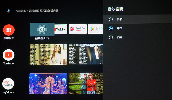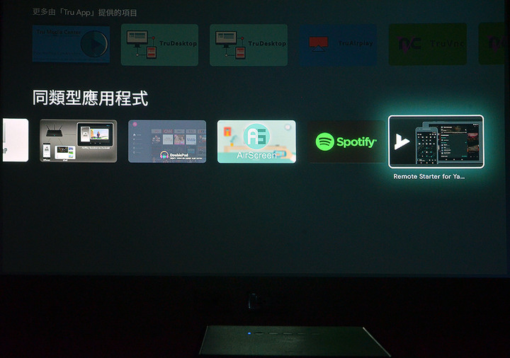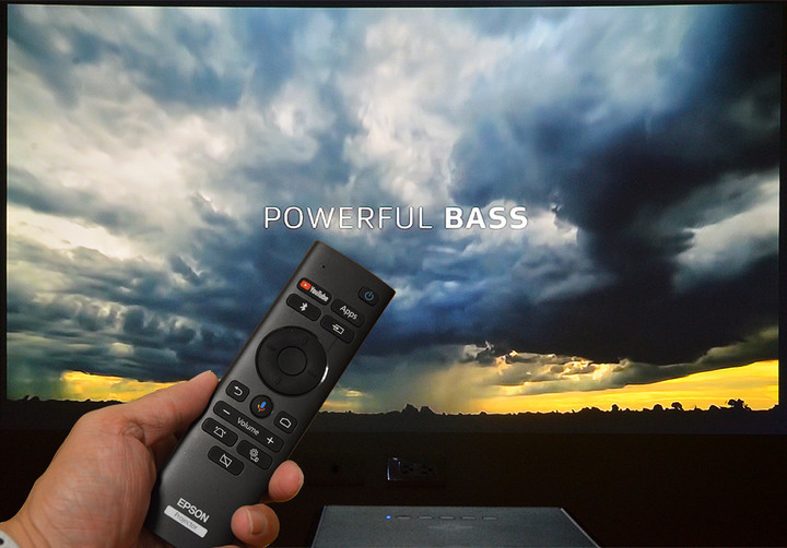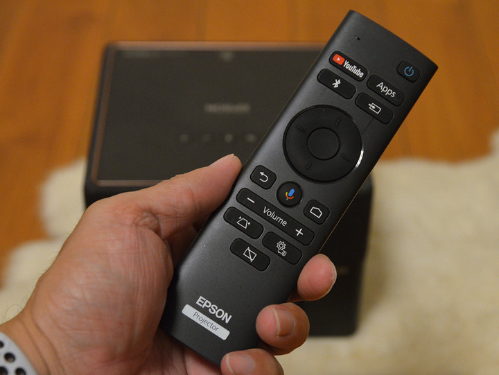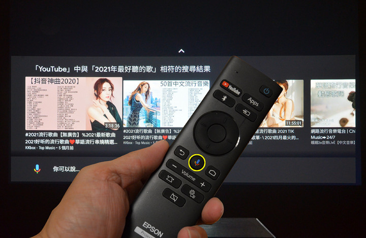 ▲ 遙控器跟一般智慧型電視或電視盒子相似,方向鍵、確認鍵、電源鍵、藍牙開關、輸入源切換、返回鍵、語音輸入、Home鍵、音量調節、梯形修正、設定,以及 Youtube、Apps 多媒體快捷鍵,可以不用透過軟體選單來慢慢挑選,透過遙控器就可直覺操作各項設定。
