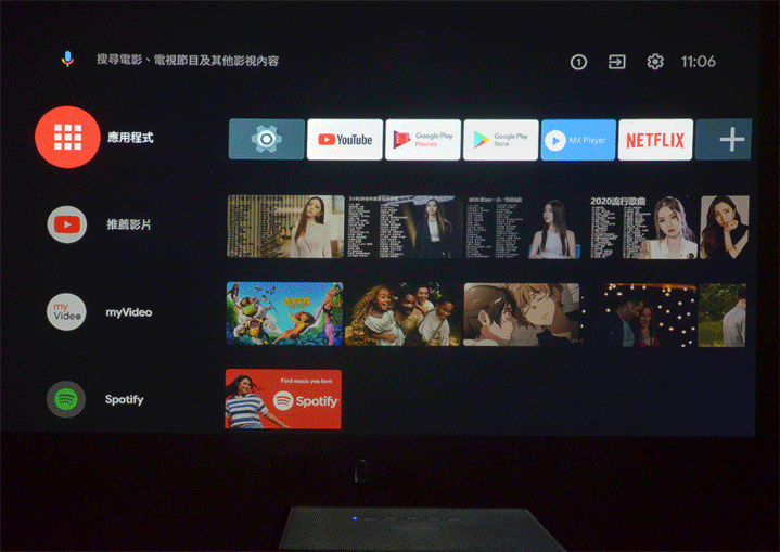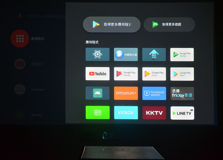 不需外接就可提供非常不錯的聲音效果,在訊源輸入方面,內建了 Android 9.0 作業系統,支援Spotify、KKBOX、Catch Play 及 Friday 影音等串流服務,也可透過 chromecast 進行手機無線投影,內建影音功能相當完整,加上搭載自動對焦『垂直/水平梯形修正功能』(垂直正負 34 度/水平正負 40 度),不須手動調焦與側投修正,對於商用開會簡報使用可以很快速的顯示出最佳的投影畫面。