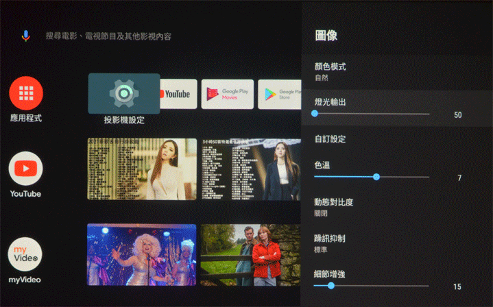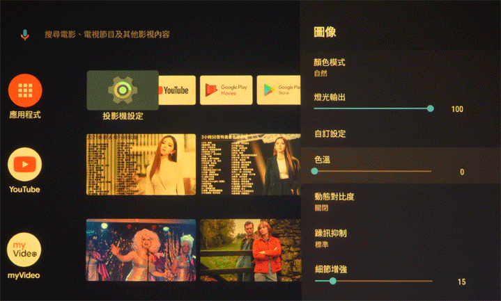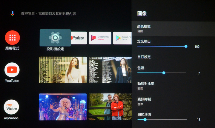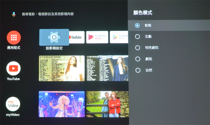 ▲ 『顏色模式』下有:動態、生動、明亮劇院、劇院、自然等模式,可依照自己正在觀看的影片來做選擇。