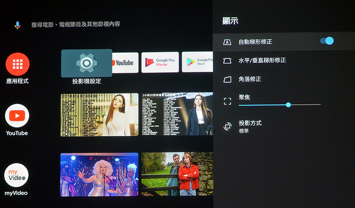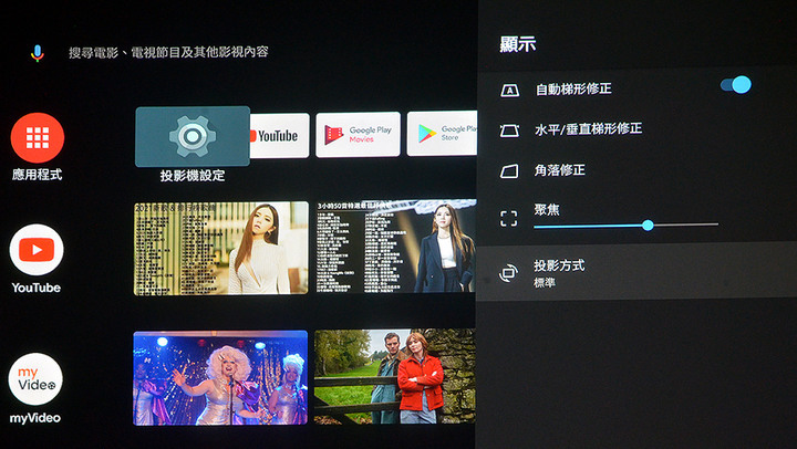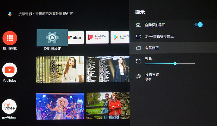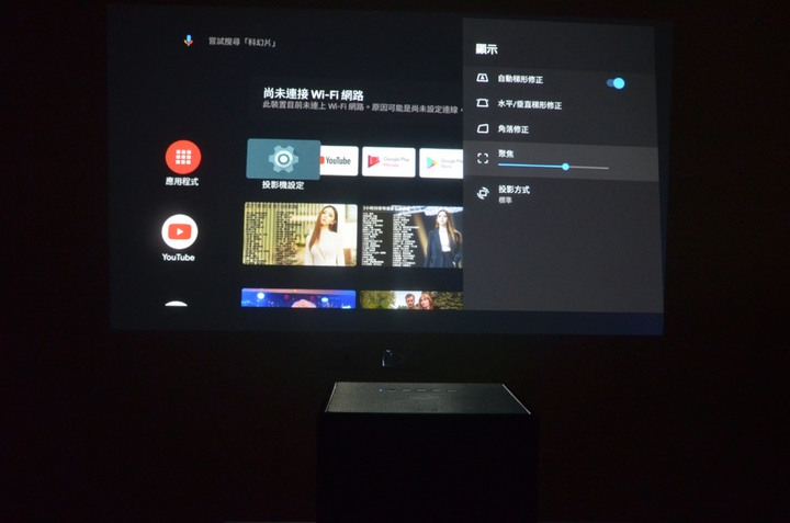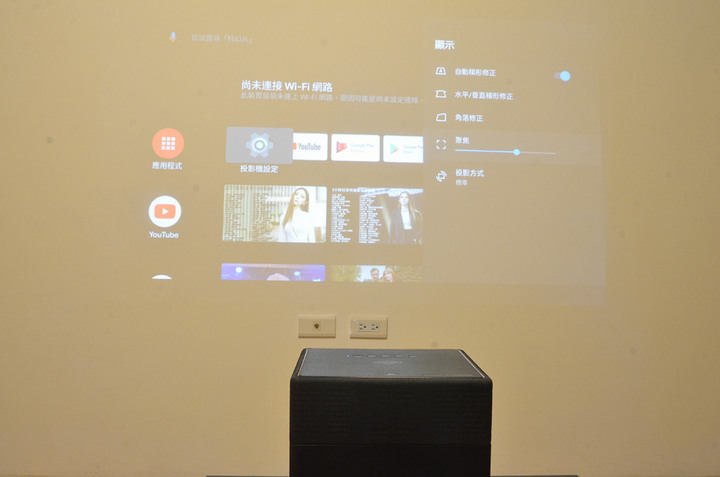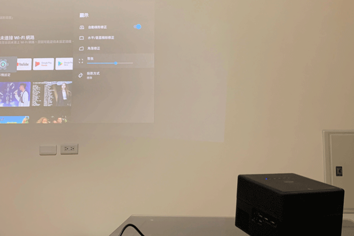 ▲ 開啟自動垂直、水平梯形修正,只要找面牆或布幕,就隨處可投放畫面。