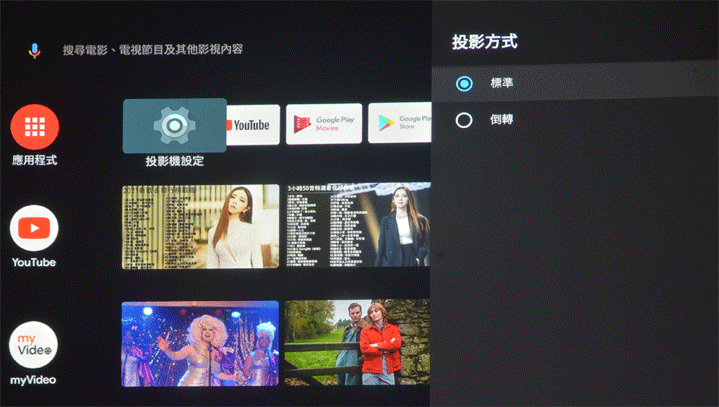 ▲ 選擇倒轉或標準的投影方式,來讓畫面呈現一般我們所看到的正常投放畫面。