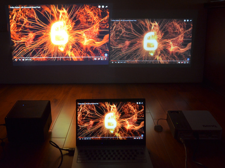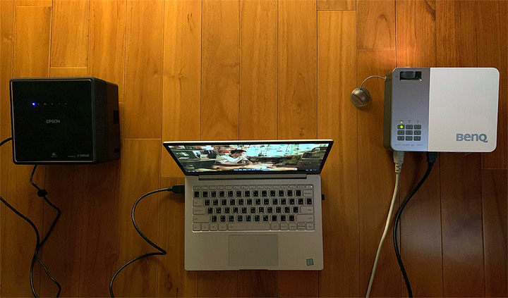 ▲ 透過 HDMI 1 進2 出分配器,將筆電內的影音直接同步輸出至左側 EPSON EF-12 與右側 BenQ GP20來做比較,這兩台投影機相同距離所投影出的差異有多大!