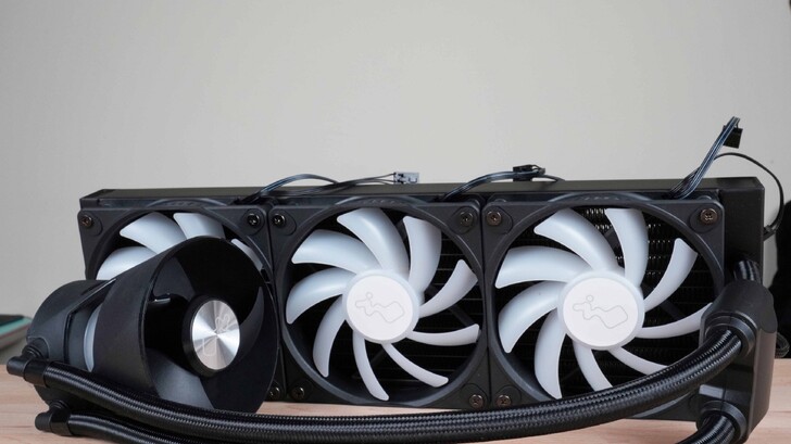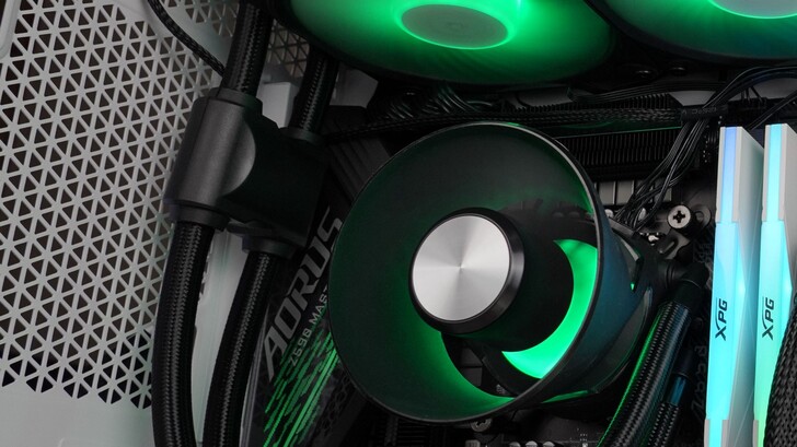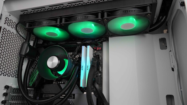 三顆風扇都具備 RGB 燈光。水冷頭上面也有一顆風扇,根據官方表示他可以透過特殊的風道設計將氣流吹向 CPU 周邊的零件。