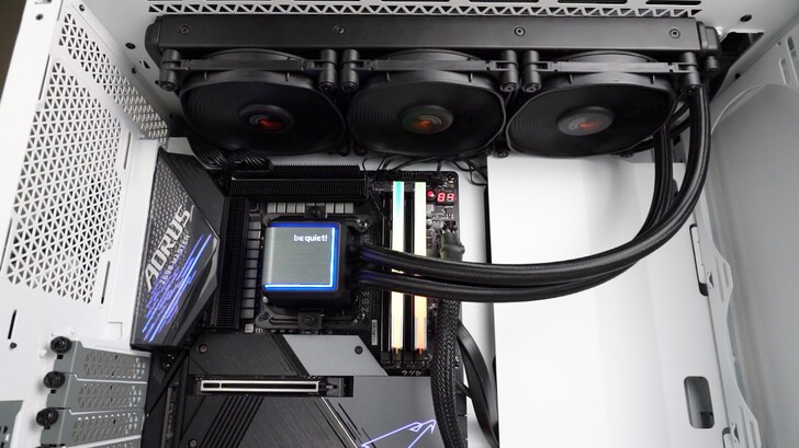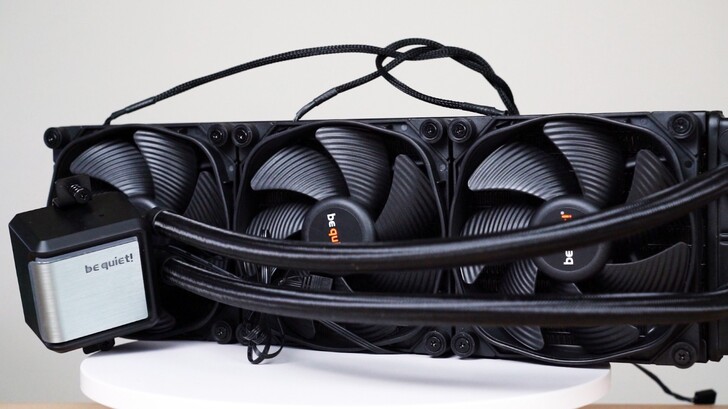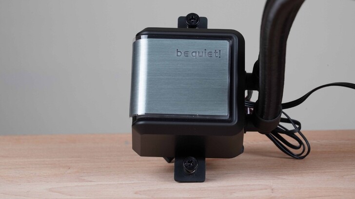 水冷頭的主視覺是髮絲紋外觀,be quiet! 的字體為白色燈光,中間金屬與周圍塑膠框之間的縫隙則是 ARGB 燈光。