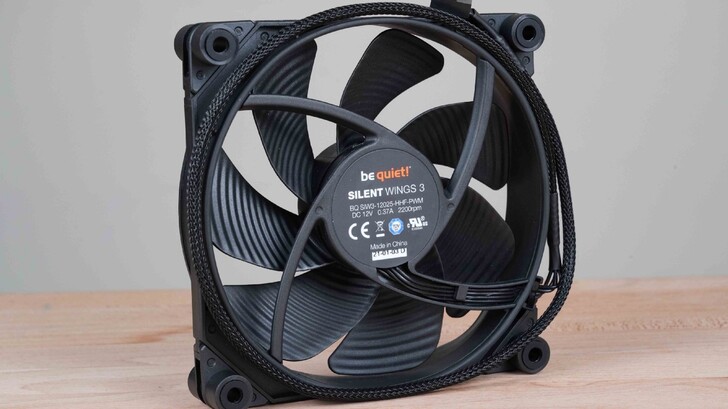 風扇的背面可以看出他的型號是 Silent Wings 3。風扇葉片的表面有特殊的溝槽,根據原廠表示「經過表面優化與結構設計提供完美風流。」而四周的風扇固定孔雙面都有橡膠圈以緩衝震動帶來的噪音等影響。