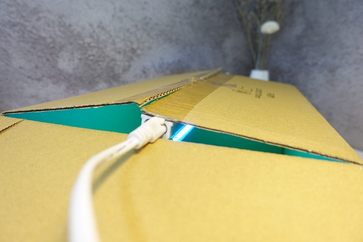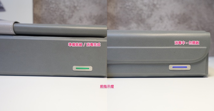 ▼ 主體前方帶有指示燈,綠色是開機準備就緒,或者消毒完成,可以讓使用者直覺知道消毒的狀態。這算是解決我土炮紫外線消毒盒不知要消毒多久的這個點,頗為直覺,啟動方式是直接接電後蓋上蓋子。