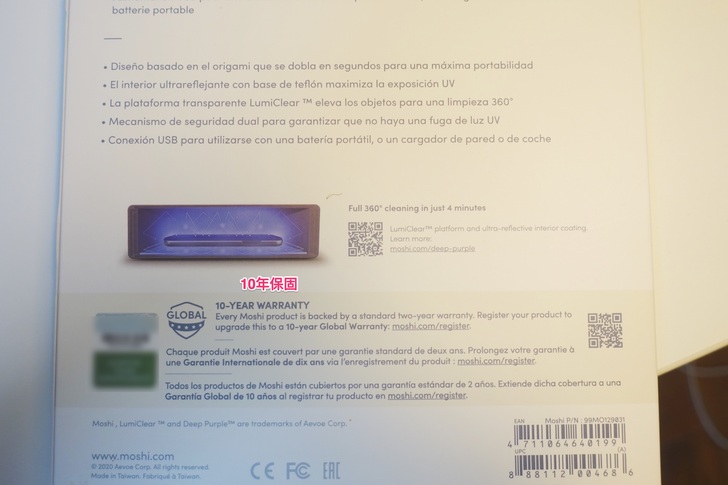 ▼ 而紫外線盒另一個考量的重點就是使用壽命,而 Moshi 的產品可以少擔心這點,整體有 10 年保固,現在 3c 家電反而很少有這麼長的保固了,加上 Moshi 北中南都有據點,直接去店面更換頗為方便。