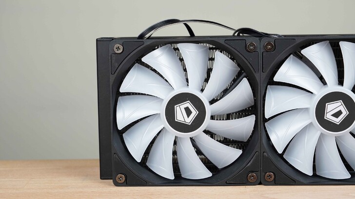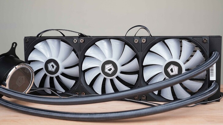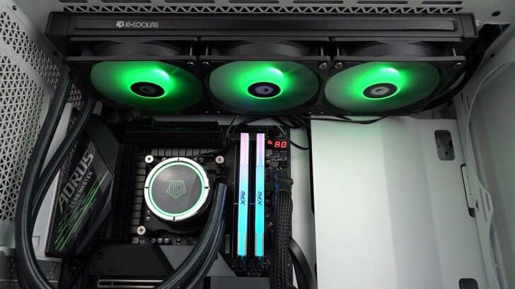 三顆風扇皆具有 ARGB 燈,水冷頭為圓形設計,中間有一個 ID-COOLING 的 LOGO。
