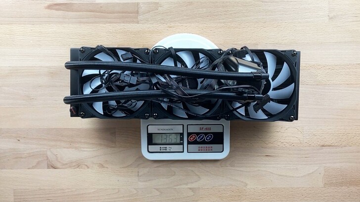 水冷整體包含風扇三合一連接線,重量大約 1,363 公克。