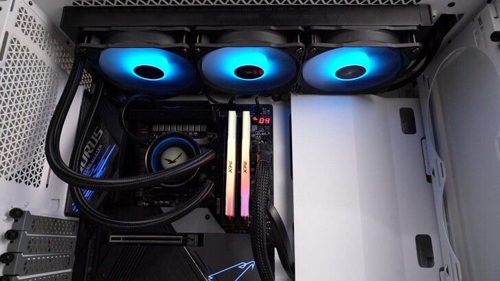 三顆風扇皆具有 ARGB,水冷頭整體為金屬質感,頂面未亮燈時有種鏡面的感覺。