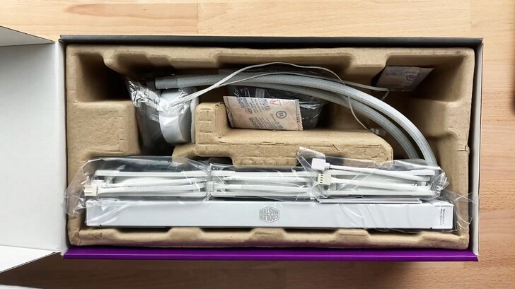 包裝內部風扇是和水冷排並排放置,配件用夾鏈袋裝著和集線盒另外放置。