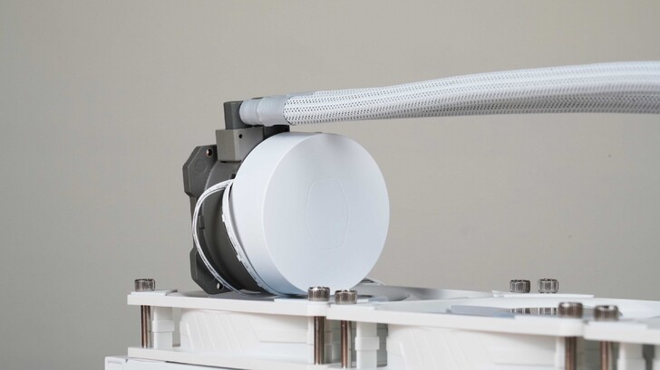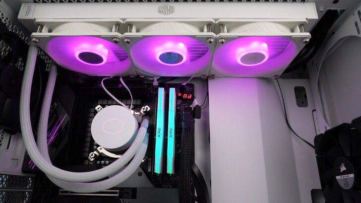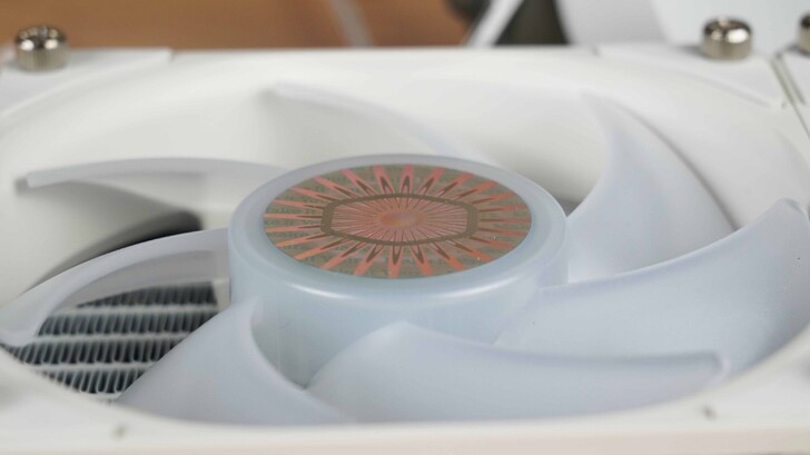 整體白色外觀質感非常好,三顆風扇都有 RGB 燈光。水冷頭底座與 CPU 接觸面為銅的材質,並沒有拋光鏡面處理。