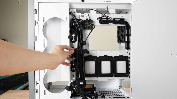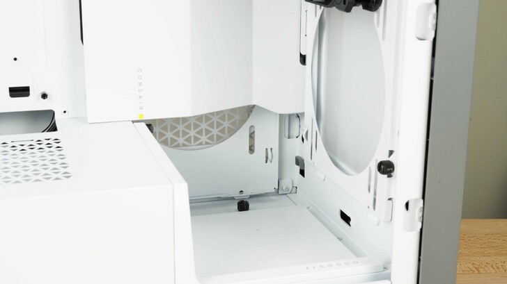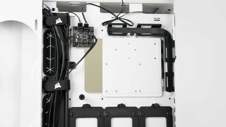 機殼下方有一個蓋板,看是要將難整理的線通通塞在底下,還是上面要放公仔都行 XD。但如果要在前面安裝 360 水冷的話,雖然有個凹槽,但是空隙是塞不下水冷排加上風扇的。