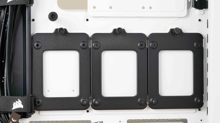 機殼下方有兩個 3.5 吋硬碟安裝架。在安裝硬碟時並不需要使用到螺絲,非常方便。除此之外從這個角度看過去,右邊可以看到手擰螺絲,想要拆除硬碟座安裝更大更長的電源供應器也沒問題。說到這個,機殼上有多處手擰螺絲,唯獨剛剛看到拆裝側板的沒有十字孔,看來海盜船為了視覺效果還特地開了新模具呀!