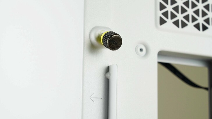 第一次開箱的時候鎖很緊,再加上下方拆側板的這個撥片離螺絲又很近,根本沒辦法用手施力將他轉下來,我還去找了一個鉗子夾著轉才行。