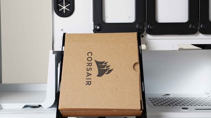 後方 PCIe 卡槽擋板以及機殼多處網孔部分都是滿滿的海盜船經典三角形。這款 5000D 也支援直立顯卡,不過直立配件需要另外購買,並沒有附在機殼包裝內。