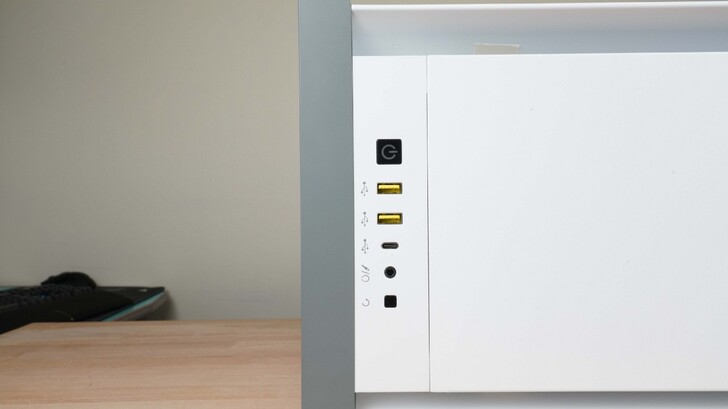 頂部的前置 I/O 區域左右邊分別是電源和 Reset 鍵,中間部分是兩個 USB 3.0 Type-A 和 一個 USB 3.1 Type-C,還有一個耳機麥克風接頭。