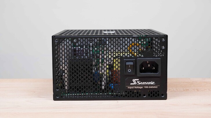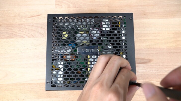 底部一樣印有電壓規格。值得注意的是底部的孔洞比較少。一般有風扇的電源通常會讓底部朝內,風扇向外吹。但這顆電源的話我會選擇相反,讓機殼內部的氣流去幫助電源散熱。不過也不是絕對,主要還是要看自己機殼的風道設計而決定。