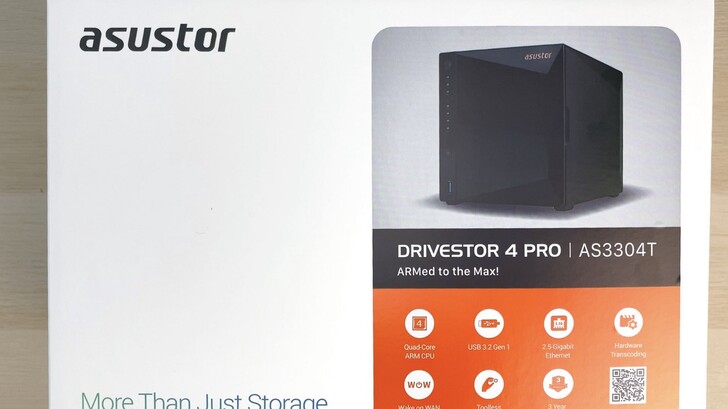 盒裝外觀依舊是 ASUSTOR 一慣的版型,非常簡潔。也可以看到這次的系列叫做 DRIVESTOR 4 PRO AS3304T,副標題是 ARMed to the MAX!沒錯,它搭載的是 ARM 架構的 CPU。